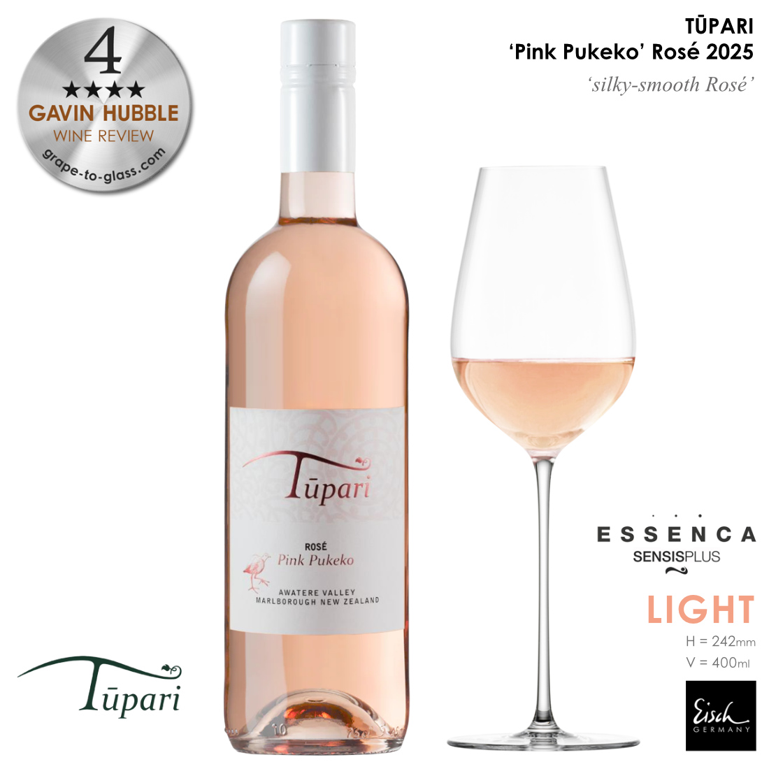 This 2025 TŪPARI ‘Pink Pukeko’ Rosé has 13% Alc./vol. Made in a near dry style with 4.1g/L R.S. Chill gently and serve in a light, aromatic wine glass at 7° - 8°C. • *NZ$25